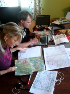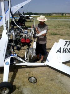 Déjà 3 jours et demi d'entrainement, dans ce bivouac international bon enfant (où il fait très chaud l'après-midi). Ce jour : pesée des ulms (et des équipages), nous devons alléger pour pouvoir être réglementaires (<450 kg au décollage), et repasser la pesée. Nous pourrons emporter 44 litres d'essence, pas plus, vu notre poids. Serge 38 litres, Eric 50 et Stéphane 70 litres. Plusieurs épreuves de test d'orientation et de régularité, plus entrainement aux précision d'atterrissage (discipline dans laquelle je ne brille pas). J'en apprends sur mon autogire et ses réglages, le prélancement rapide (rotor à 280 trs/min, ça décolle sec !), le pas d'hélice (pas à 13°, moi qui ai volé 1 an à 11° !), la netteté du rotor (protection de bord d'attaque ôtée), la vraie contenance du réservoir, la consommation. Super (ça rend humble...)